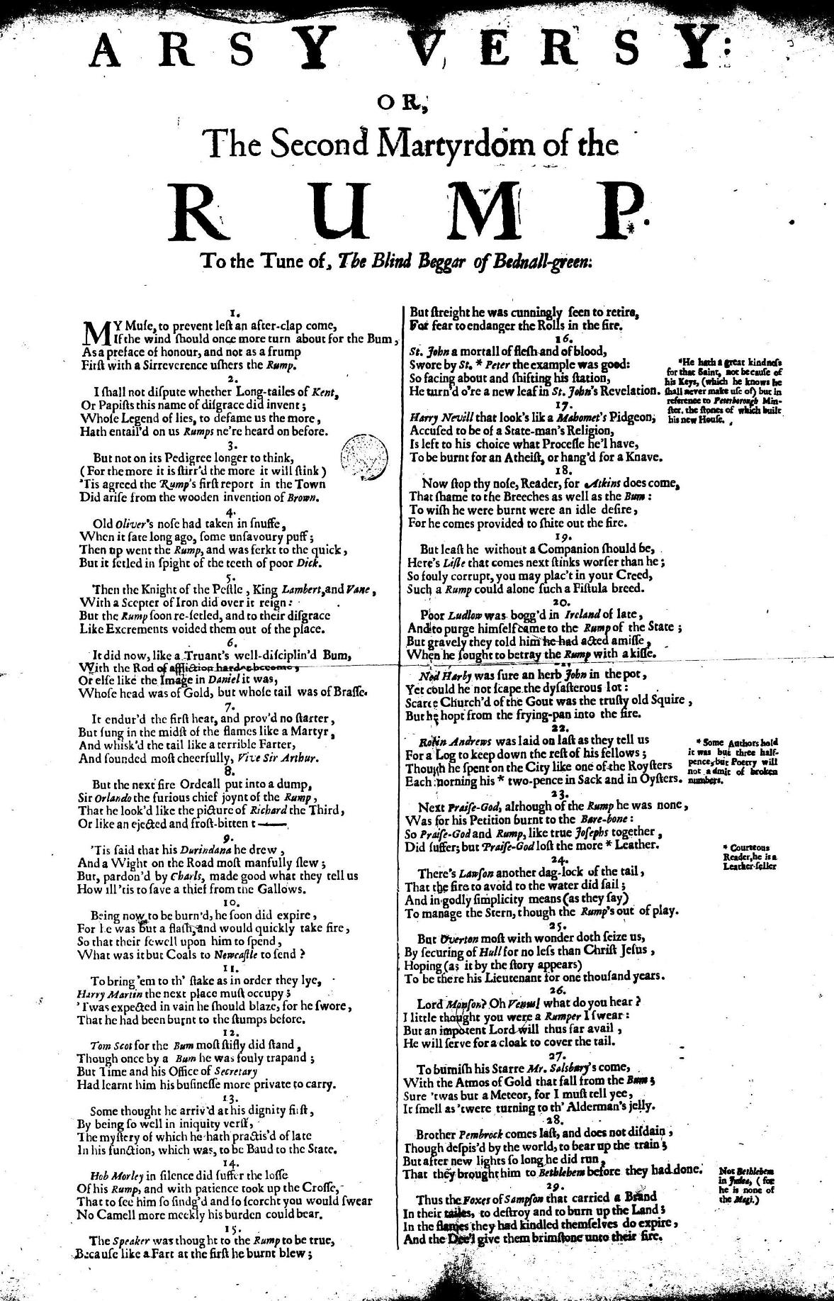 But satirical writers were happy to take things further and play on the more literal wording of the term. ‘Arsy Versy: Or, the Second Martyrdom of the Rump’, an anonymous pamphlet published early in the Restoration, is a cutting piece of scatalogical drollery. The term doubles as a motif of political upheaval and as an exultant self-description of the genre.
